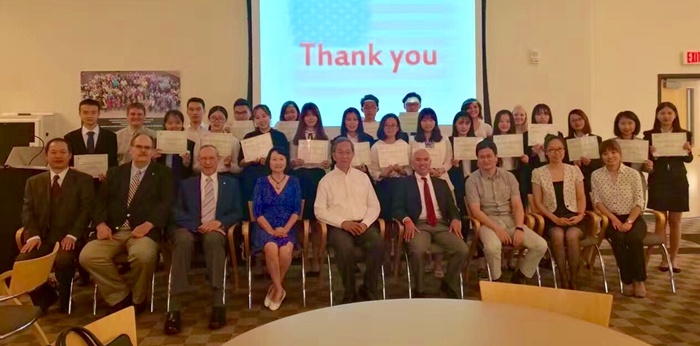 7月28日,项目举行汇报会及结业典礼,赛基诺州立大学副校长Marc H.Peretz、项目捐赠人李葆元夫妇出席。汇报会上,同学们对各自的设计进行分析和展示,教授评委们对同学们独特新颖的创新思维表示了赞赏和肯定。商业计划展示之后,同学们还针对自己在美国所学、所见、所悟开展了交流。他们纷纷表示此次学习和实践的收获很大,不仅提升了英语表达水平,还能将美国的创新、创业模式学以致用,同时还感受到了美国文化的开放与包容。同学们在演讲中还表达了对各方的感谢,感谢塞基诺州立大学商学院和国际交流处的精心安排,感谢各位教授以及志愿者提供的各种帮助,感谢捐赠人李葆元先生的慷慨和无私。