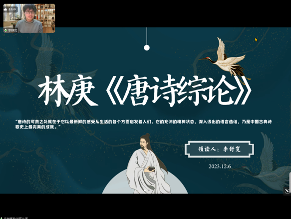 明心读书会第二十季第七场讲座召开。12月6日,人文学院中文系主任王宏超老师邀请北京大学中国古代文学专业博士研究生,上海师范大学2013级汉语言文学(文科基地)专业校友李舒宽为第二十季“明心”读书会作《唐诗综论》导读讲座。