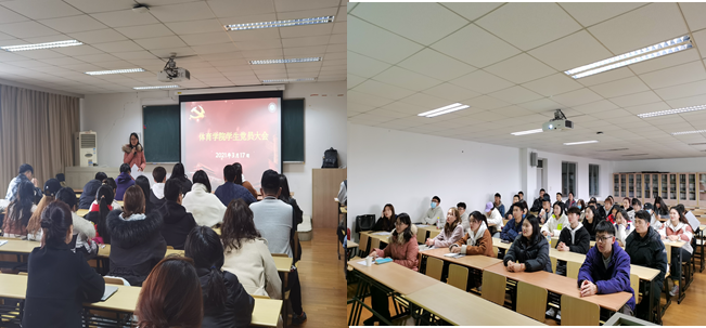☆体育学院 3月17日13:00,学院在体育馆307召开学生党员大会。体育学院党委副书记、副院长卢丹凤、辅导员及全体学生党员出席会议。会上,卢丹凤对全体学生党员开展党史学习教育做了动员,并在会上集体观看了党史纪录片《中共二大会址纪念馆:首部党章的诞生和保存》。随后,各学生党支部进行了换届选举和民主评议,并聚焦党史学习教育主题分批开展了学习交流。