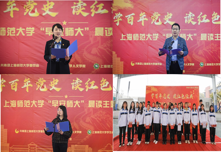 ☆人文学院 为营造浓厚的校园文化氛围,强化优良校风学风,提高读书意识,丰富精神文化,以实际行动庆祝中国共产党建党100周年,上海师范大学人文学院联合校团委于4月1日7:00在风雨篮球场举行了“学百年党史,读红色经典”早安师大晨读活动启动仪式。上海师范大学团委书记潘黎勇,上海师范大学团委副书记金黎琼,人文学院党委书记朱政,人文学院党委委员、历史系系主任高红霞,人文学院教工党支部书记、中文系副系主任刘畅以及各年级辅导员共同出席启动仪式,人文学院2021年上半年入党发展对象、2020级本科班团骨干、高中高校推优一体化学员参会。活动由人文学院党委副书记、副院长陈重来主持。
