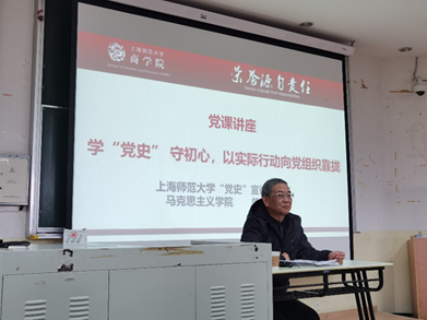 ☆商学院 3月31日下午,上海师范大学商学院分党校2021年上半年入党积极分子学习班开班典礼暨第一次党课在奉贤校区第四教学楼D座200隆重举行。此次党课以“学‘党史’守初心,以实际行动向党组织靠拢”为主题,上海师范大学党史学习教育宣讲团成员、马克思主义学院单冠初教授主讲。通过回顾党的历史和分享自身的经历,将历史与生活感受结合,进一步引导入党积极分子坚定理想信念,做到知史爱党、知史爱国。