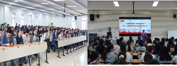 ☆化材学院 3月31日下午,在学院党委书记和教工党支部书记的带队下,由知名教授、硕士点负责人、专业负责人、一线骨干教师等16位专业教师组成的党员教师面对面团队,来到奉贤校区与本科生进行交流。活动分为两个阶段进行,第一阶段在主会场进行,由三位经验丰富的老师分别从就业、升学和科研创新等方面对参与活动的全体学生进行讲解和指导。第二个阶段根据学生专业分别设置三个分会场,并匹配专业相近的老师前往分会场与同学们进行现场答疑、互动交流。