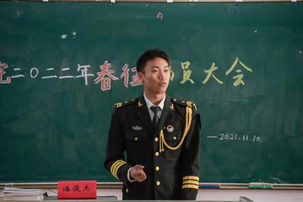 家国情怀,是从小我到大我的蜕变,更是爱国之心与铁血意志的体现。数理学院邀请了姜宇珂和潘俊杰两位退伍兵,为新生们进行了2022年春季征兵入伍动员。姜宇珂向大家分享了军旅生活中的点滴以及在军营任职炊事员的心理历程。回忆起自己苦中作乐,苦中有乐,变苦为乐的两年,姜宇珂嘴角不禁浮出笑意,引发了在场同学们的敬佩之情以及对美好军旅生活的向往。随即,潘俊杰从自身经历切入,分享了他奋不顾身,投身祖国国防经历,让同学们懂得了什么是坚强,懂得了什么是担当,懂得了承担责任,努力成为国家的栋梁。恰同学少年,风华正茂,应志在四方,踏一路青春风采,走一程无悔人生。