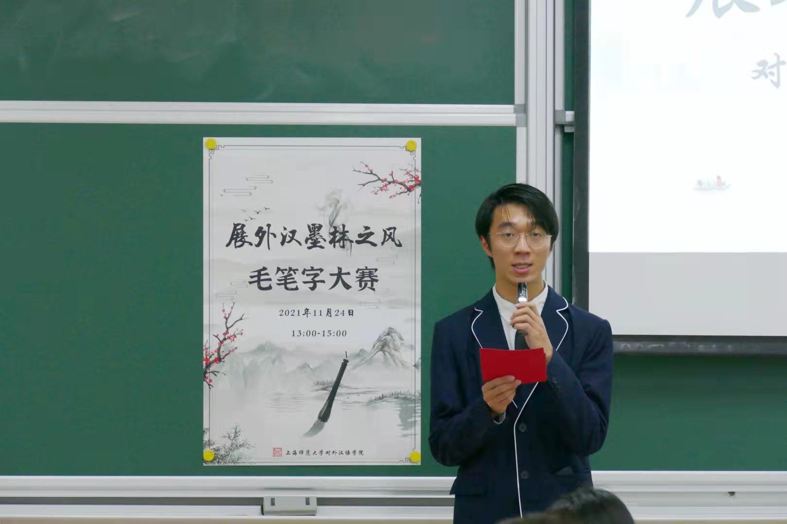 为了向外汉学子们展示书法的魅力与价值,让同学们感受到中华文化之博大和悠久历史之厚重,对外汉语学院于2021年11月24日13时,在第五教学楼A座111室开展了中华文化月系列活动之“展外汉墨林之风”毛笔字大赛。对外汉语学院兼职辅导员陆熠、对外汉语学院团委兼职(学生)副书记顾莹莺、对外汉语学院学生会执行主席凌元雪、对外汉语学院团委宣传部负责人蒋依琳担任本次活动的嘉宾。对外汉语学院2021级和2020级部分同学到场聆听。2021级汉语国际教育2班的金方钰同学主持本次活动。