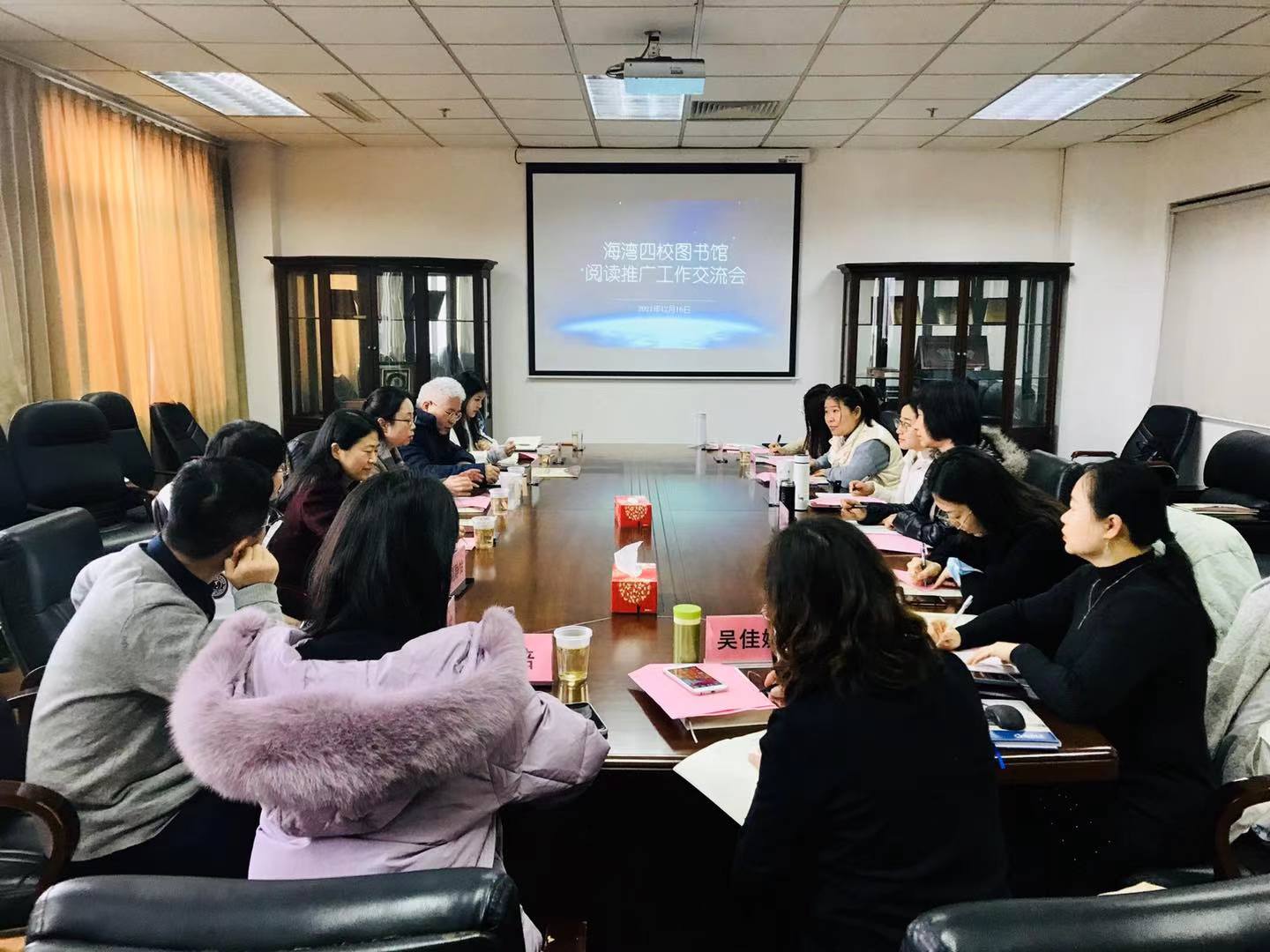 12月16日上午,海湾四校图书馆阅读推广工作交流会在奉贤校区图书馆五楼会议室召开。华东理工大学图书馆副馆长常亚青、上海应用技术大学图书馆副馆长刘欣怡、上海旅游高等专科学校图书馆副馆长梁峥、我馆副馆长段晓林及四馆阅读推广业务相关馆员近20人参加会议。会议由段晓林主持。四位分管阅读推广工作副馆长分别介绍2021年度本馆相关工作的基本情况。四馆阅读推广工作具体负责人向大家分享各自有特色的典型案例,内容涵盖情绪管理阅读、真人图书馆、午间工作坊、展览展示、红色经典阅读、微信公众号运营与分析、英文原著立体阅读等诸多方面。我馆馆员就拟在四校联合推出的“一日一诗”古诗词立体阅读活动的理念、流程、设计及具体执行方案进行说明。
