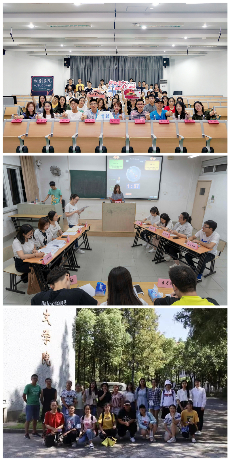 ★ 学院活动 9月18日,教育学院、化学与材料科学学院联合举办班团骨干培训活动(上图);生命科学学院与化学与材料科学学院联合举办“卓思杯”新生辩论赛(中图);人文学院举办第五届青年纽扣工程暨2019级团支书培训会(下图)及社团招新等活动。