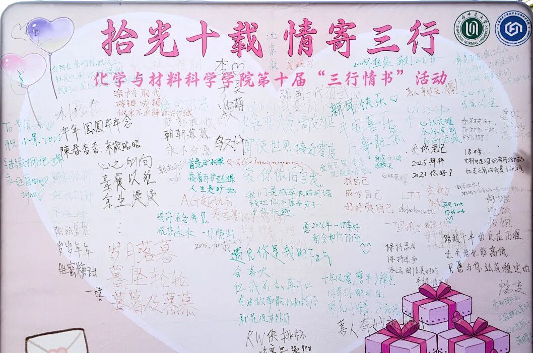 化学与材料科学学院于2025年12月开展了第十届“三行情书”线上线下活动。活动鼓励同学们创作优美的三行情书来抒发真情实感,可以是对亲人、师长、朋友的思念与感激,可以是对心仪对象的真挚告白,也可以是对未来的憧憬等等。在活动中,同学们能够深入挖掘内心情感与思想,拓宽生命表达方式,升华对生命、爱情、友情、师生情等多元情感的理解与感悟,进一步思考人生意义与价值。在冬日的暖阳中,同学们用笔尖表达情感,感谢每一份真诚的投稿、每一次用心的参与,是你们让“三行情书”走过了十年,感谢相伴!